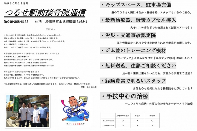 つるせ駅前接骨院は酸素カプセルの導入や女性スタッフもいる接骨院で東武東上線鶴瀬駅から徒歩5分の駅近です。